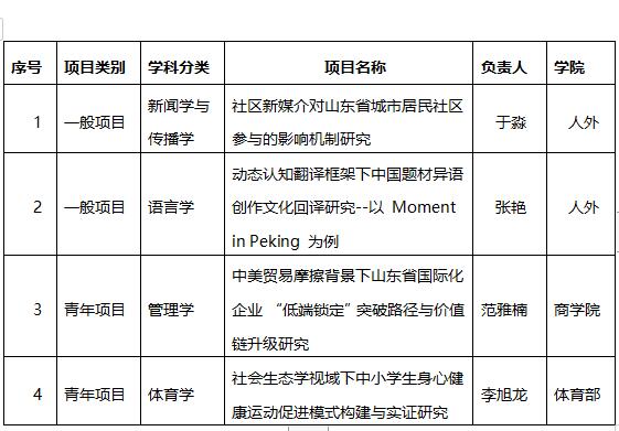近日,经过前期申报、评审、公示等程序,山东省哲学社会科学规划办公室正式下发2020年度省社科规划研究项目立项通知。伟德官网4项项目获得立项,其中,一般项目和青年项目各2项;人外学院2项、商学院和体育部各1项。