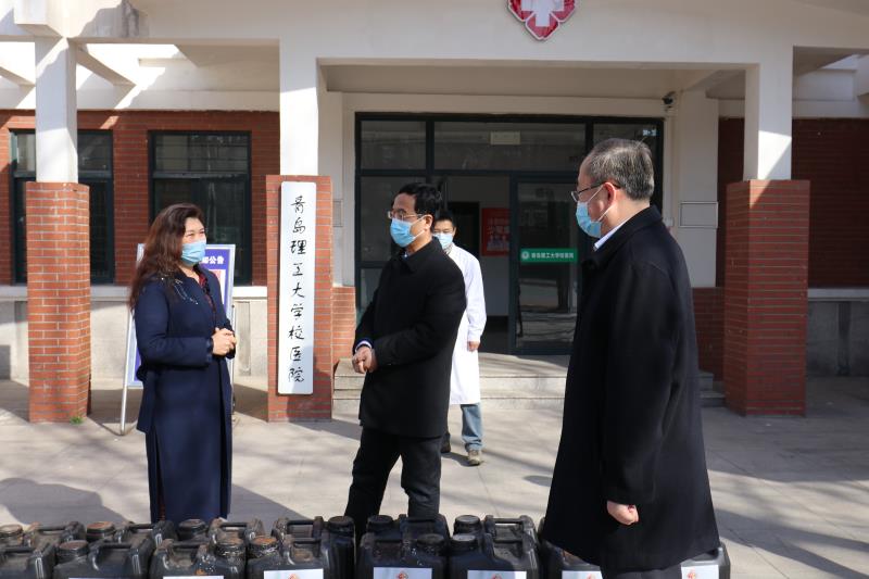 在学校资产管理处的联系协调下,3月16日上午,山东盛和招标代理有限公司董事长侯艳丽一行来到嘉陵江路校区,向学校捐赠500公斤消毒液,助力学校新冠肺炎疫情防控工作。校党委常委、副校长、防控工作领导小组办公室主任齐德义代表学校接受捐赠。学校资产管理处、后勤管理处有关同志参加捐赠活动。