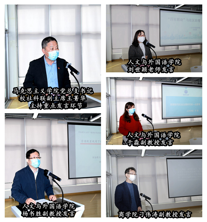 在专题发言环节,来自人文与外国语学院的社会学博士杨书胜副教授、社工教研室主任刘世颖老师、传播学博士于淼副教授、商学院经济学博士刁伟涛副教授结合自己的研究方向进行了“资源配置视角下社区治理效能瓶颈问题分析”、“‘四社联动’与社区治理“、”新媒体与社会治理研究的一点思考”、“公民参与、信息公开与社会治理”的精彩分享。