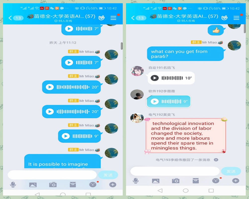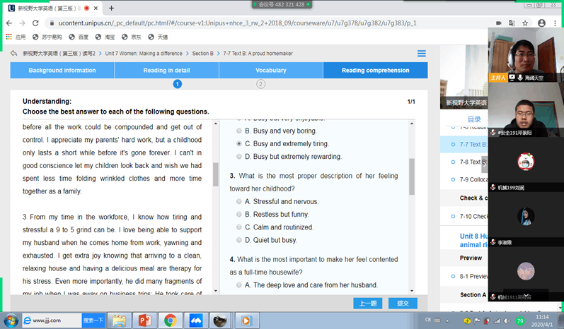 石发亮老师认为,将语音作为重要抓手,采用QQ群语音屏幕分享结合U校园平台的线上教学模式是比较适合大学英语课程的一种选择。这种模式兼顾了大多数学生的网络学习条件,线上线下相结合,注重线上时段的互动,有利于抓住学生的注意力,增加网课的乐趣。语音屏幕分享的过程中,学生开麦互动时,偶尔会传入一点家庭环境中锅碗瓢盆、小狗叫等生活的声音,这无形中为严谨认真的学习氛围平添了几分斑斓的跳跃色彩,为网课增加了一些传统课堂所没有的独特的小花絮。