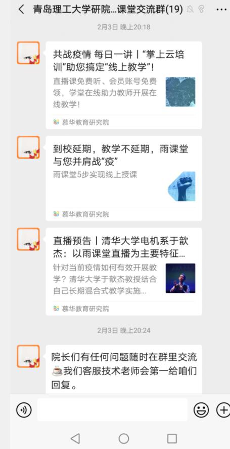 平台搭建及培训。2月29日,研究生处发布公共课《2020春学期伟德国际1946bv官网学堂云4.0学生学习手册》及《2020春学期伟德国际1946bv官网学堂云4.0教师操作手册》。研究生公共课任课老师及教学管理人员加入了青理工研究生雨课堂交流群,提前学习掌握操作,为线上教学做好充分准备。
