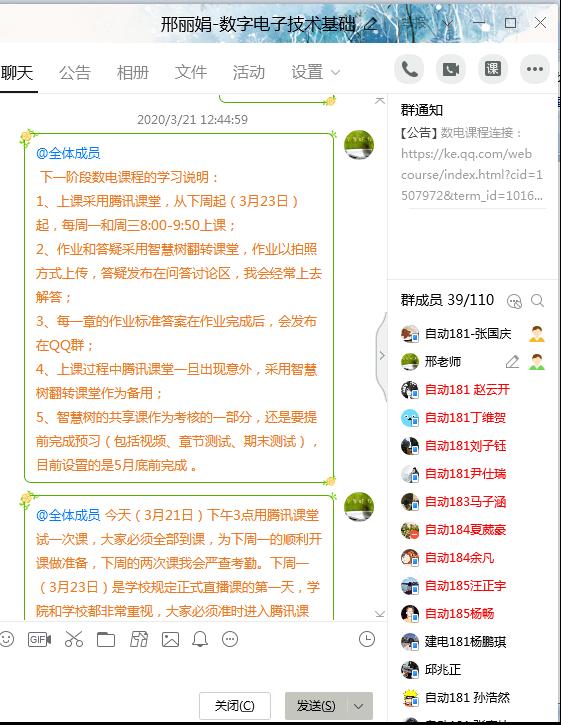 《数字电子技术基础》课程的特点是有大量的电路描述和习题讲解,直播平台需要有较强的互动教学功能,经过权衡对比以及与学院其他老师的交流,最终采用“腾讯课堂+智慧树平台+QQ课程群”的授课方式,充分利用各平台的优势。利用腾讯课堂强大的直播互动功能进行在线教学,根据智慧树提供的丰富资源和便于作业考评管理的优势,将其作为课程预习和布置作业、提交作业的平台。为应对直播时腾讯课堂可能发生的问题,将智慧树翻转课堂作为腾讯直播课堂的备用课堂。前期在线辅导过程中已建立QQ课程群,为随时解答学生疑问、及时发布信息提供了方便。在线教学继续利用QQ课程群作为师生快捷互动的交流工具,完成提供学习资料(课件、电子版教材、拍照作业答案)、随时互动答疑、及时发布消息等功能。