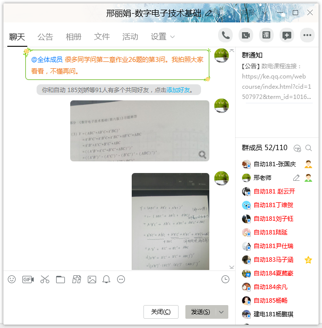 课后答疑是在线教学的重要补充,可进一步充实、完善课堂教学内容,提高教学效果。课后答疑能有针对性地解决学生在学习过程中产生的疑问,加强师生间的交流和沟通,提高学生学习的兴趣和积极性。课下学生总会提出各种问题,或者在智慧树平台提出,或者在QQ课程群提出,或者以私聊我的方式提出。我在课后答疑的过程中,除了针对性解决学生提出的问题,还引导学生改进学习方法和课程思维方法,培养学生独立学习、独立思考以及数字电路逻辑的思维能力。如果文字、语音或拍照的形式难以解释清楚,则采用腾讯课堂开启临时直播课堂进行讲解,让同学们对问题的解答有更为清楚的理解。