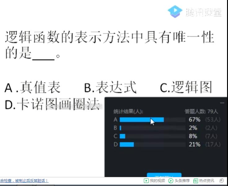 为让学生形成积极参与教学过程,更好地了解学生对知识点的掌握情况,我在课程中常常加入一些测试题进行互动,通过统计结果随时调整讲课进度。鼓励所有同学都答题,答错没关系,这是不记名的,学生放下思想包袱,所以答题人数多,统计结果能比较准确反映整个班级同学对知识的掌握程度。当学生经过自己参与、探索之后有所发现、有所收获、有所提高,便能激发学生的学习热情。直播授课的过程中,我会随时关注讨论区,看是否有学生反映课堂平台的运行情况,是否有学生随时提出疑难问题。如果有问题,可以随时解决。在线上教学时,利用腾讯课堂平台的签到功能和学生参加学习的记录,可以掌控学生参与学习的情况,进而强化课堂纪律。若有个别同学由于一些原因无法按时进入在线课堂学习,腾讯课堂平台有回放功能,每次课后的回放视频可以随时听,使得线上授课的优越性更好地体现出来。