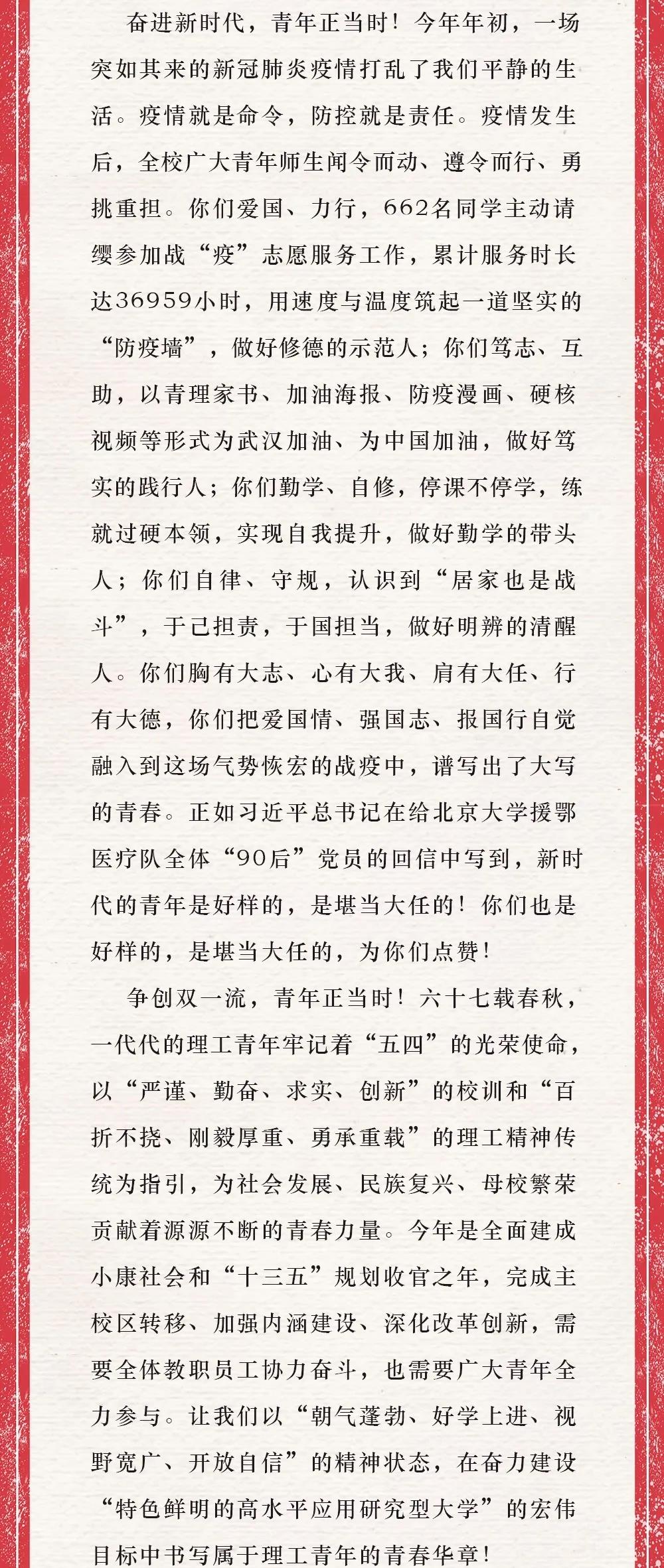 党委书记王亚军、校长谭秀森 致全校青年朋友们的一封信