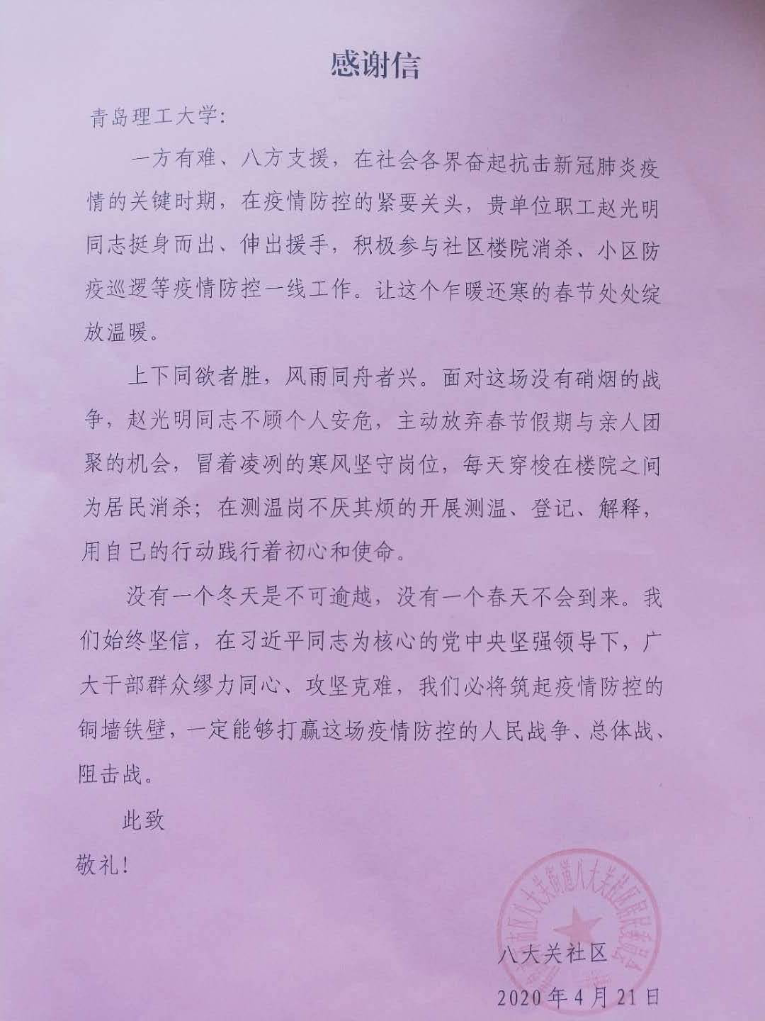 近日,伟德官网收到八大关社区发来的感谢信,信中对伟德官网艺术与设计学院赵光明老师主动参与社区疫情防控工作进行了表扬与感谢。