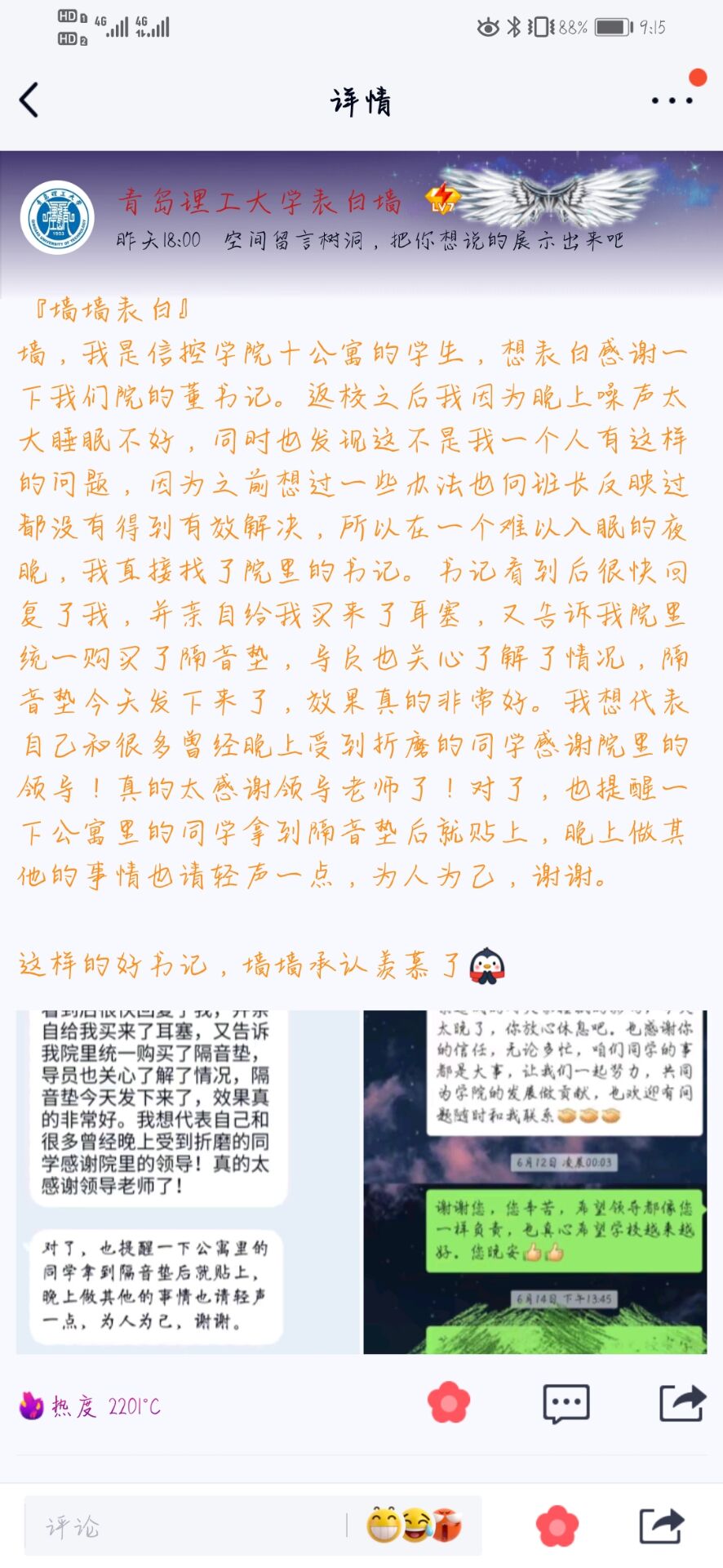 “墙,我是信控学院十公寓的学生,想表白感谢一下我们院的党总支书记董典同。返校之后我因晚上噪声太大睡眠不好,同时也发现这不是我一个人有这样的问题,因为之前想过一些办法也向班长反映过都没有得到有效解决,所以在一个难以入眠的夜晚,我直接找了院里的书记。董典同书记看到后很快回复了我,并亲自给我买来了耳塞,又告诉我院里统一购买了隔音垫,导员也关心了解了情况,隔音垫今天发下来了,效果真的非常好。我想代表自己和很多曾经晚上受到折磨的同学感谢院里的领导!真的太感谢领导老师了!”