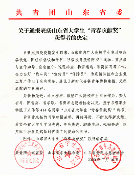 近日,由共青团山东省委员会、山东省学生联合会、山东省青年志愿者协会联合开展的山东省大学生“青春贡献奖”评审结果揭晓,对全省414名大学生给予通报表扬。伟德官网石佳、郭淑一、李可心、林兆宇、侯文轩等5名同学凭借抗击疫情期间的突出表现光荣上榜。