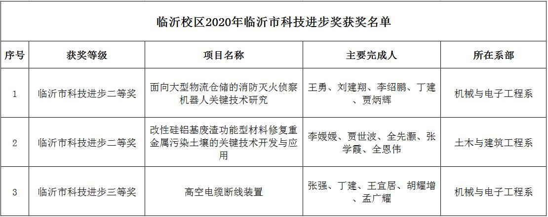 临沂市科技奖作为临沂市人民政府设立的市级最高科技奖,每年评选一次,表彰奖励在科学技术进步活动中作出突出贡献的科技工作者。校区机械与电子工程系教师王勇科研团队成果“面向大型物流仓储的消防灭火侦察机器人关键技术研究”、土木与建筑工程系教师李媛媛老师科研团队成果“改性硅铝基废渣功能型材料修复重金属污染土壤的关键技术开发与应用”2项成果荣获二等奖;机械与电子工程系教师张强科研团队成果“高空电缆断线装置”荣获三等奖。