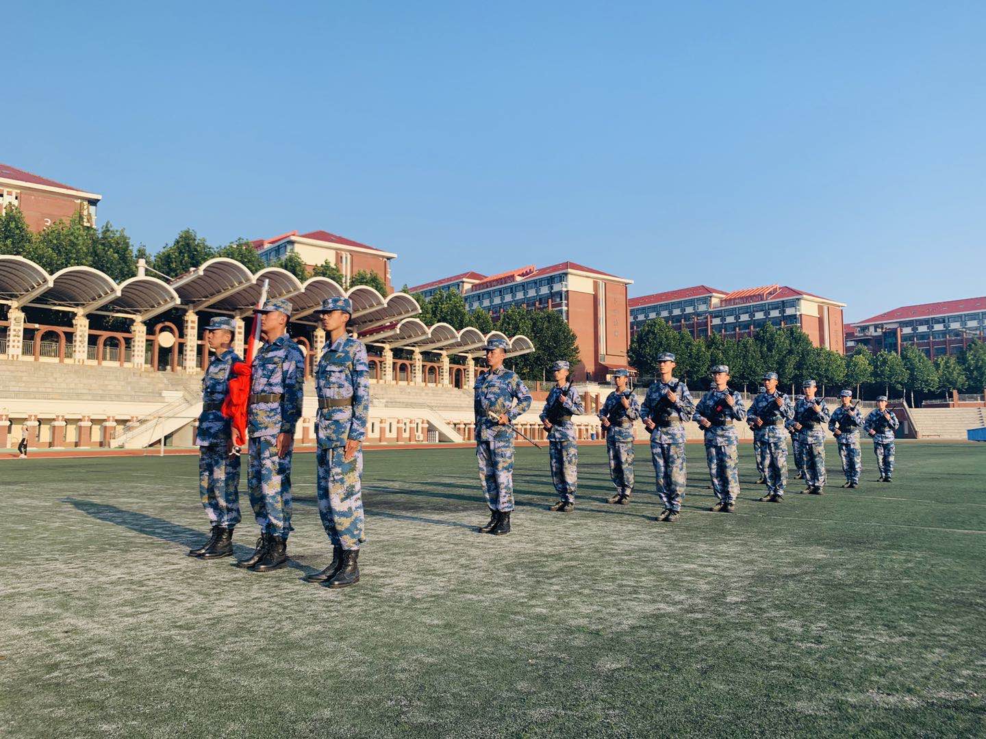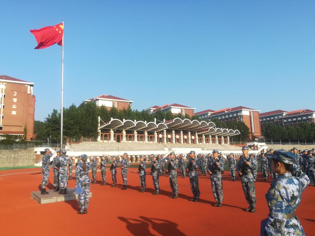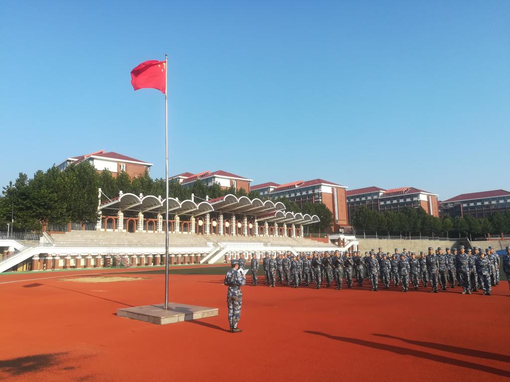 清晨7点,迎着初升的朝阳,国旗护卫队队员昂首挺胸,迈着铿锵有力的步伐,踏着整齐划一的脚步,稳步走向国旗台。参加本次升国旗仪式的国护队员,作为学校2020年学生训军教官团的成员,接受了为期十天的业务集训。烈日下,他们晒得黝黑的皮肤宛如勋章,炯炯有神的双眼中释放出坚毅的光芒,无声诉说着对国旗的热爱与信仰。随着庄严的国歌奏响,扬旗手振臂一挥,鲜艳的五星红旗冉冉升起,迎风飘扬在操场上空。学生军训教官团全体成员列队整齐,满怀敬意,庄严肃立,高声唱响《义勇军进行曲》并向国旗敬礼 。