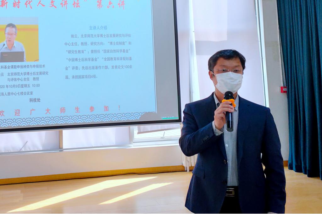 10月9日,北京师范大学姚云教授做客“新时代人文讲坛”,作了题为《社科基金课题申报种类与申报技术》的报告。报告会由党委常委、副校长于德湖主持,科技处处长李长河、副处长周红燕以及各学院教师参加了本次报告会。报告会同时采用腾讯会议的方式进行了网络直播。