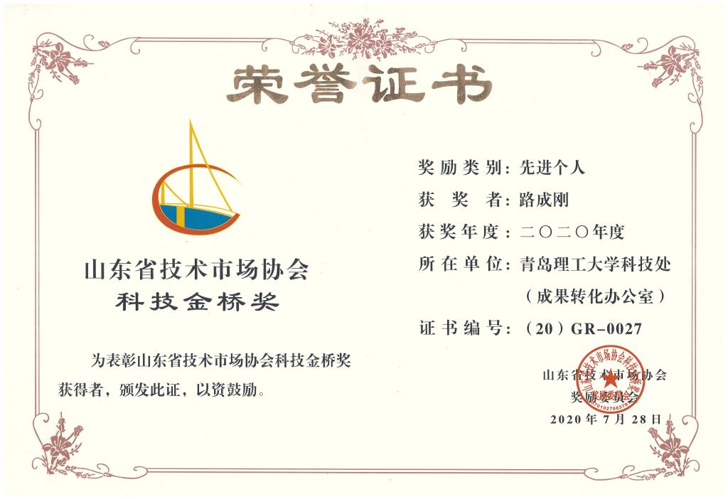 10月18日,2020年度山东省技术市场协会科技金桥奖表彰大会在济南市举行。对全省在促进科技成果转移、转化,“政产学研金服用”协同创新,助推新旧动能转换重大工程等方面做出突出贡献的10个先进集体、30名先进个人、60个优秀项目和10个优秀组织单位进行表彰奖励,其中,伟德官网科技处(成果转化办公室)路成刚同志获得科技金桥奖先进个人。