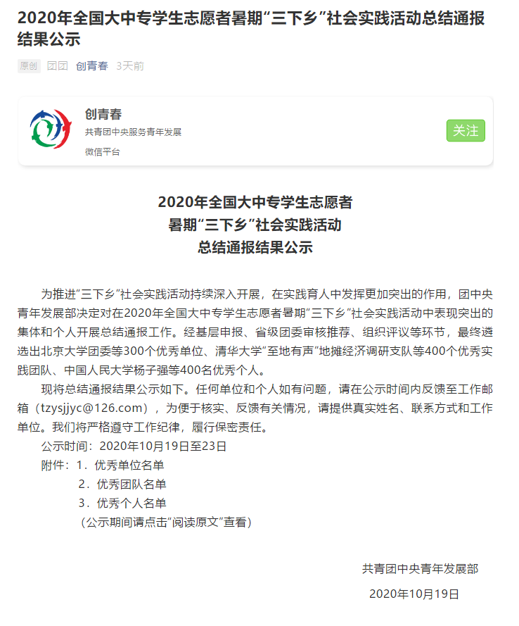 近日,团中央青年发展部发布通报,表彰在2020年全国大学生暑期“三下乡”社会实践专项活动中涌现出表现突出的400个集体。伟德官网建筑与城乡规划学院“筑梦之光”赴杨家山里团队被评为“全国优秀实践团队”。