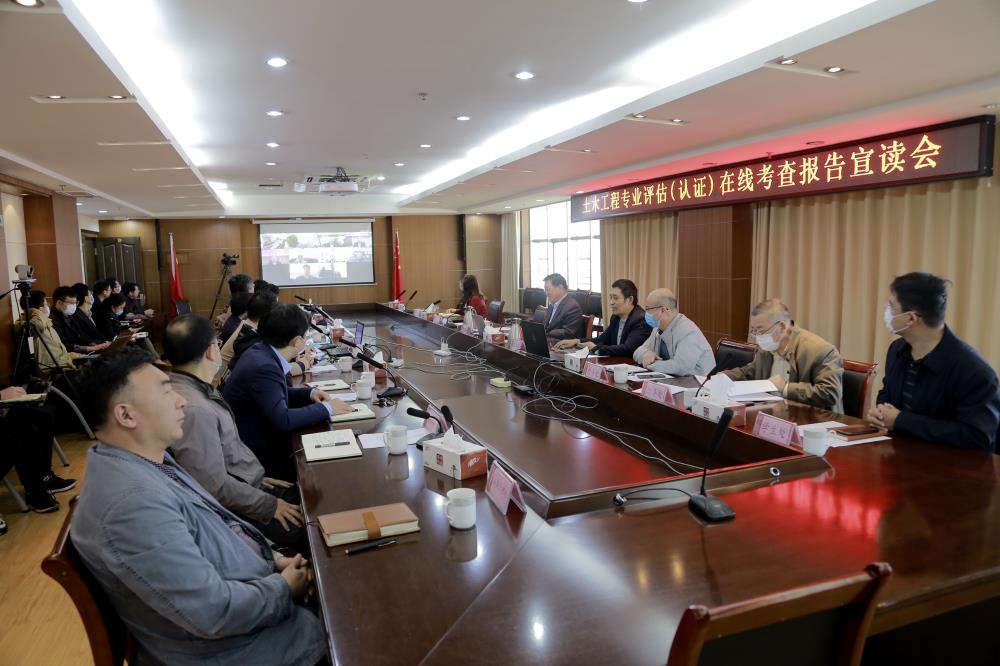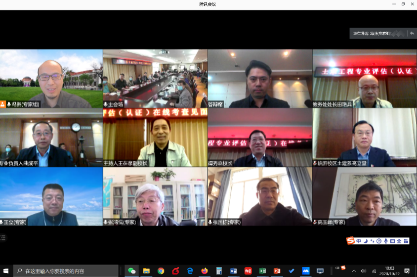 校长谭秀森代表学校致欢迎辞,对专家组的线上考查工作表示欢迎并简要介绍了学校、土木工程专业的建设情况并汇报了2014年复评通过以来,针对评估专家上次提出的问题和不足,学校所做的主要工作。专家组组长冯鹏教授向与会人员介绍了土木工程专业评估(认证)工作背景和工作要求,就这次线上集中考查的前期工作,考查目的及工作安排进行了说明。并对学校前期配合在线考查所做的工作进行了充分肯定。土木工程专业负责人补充汇报了专业建设相关情况。