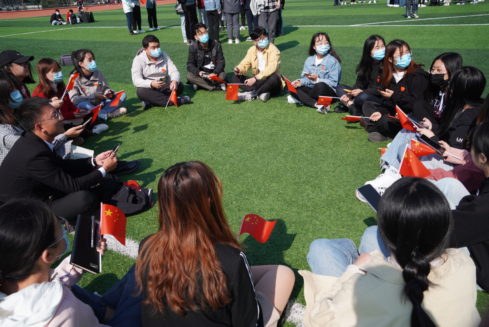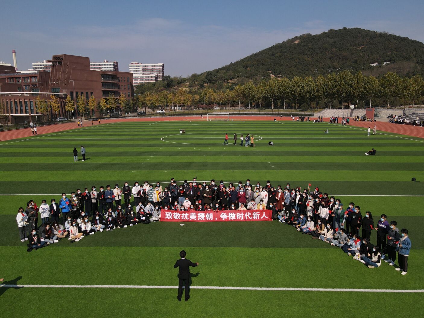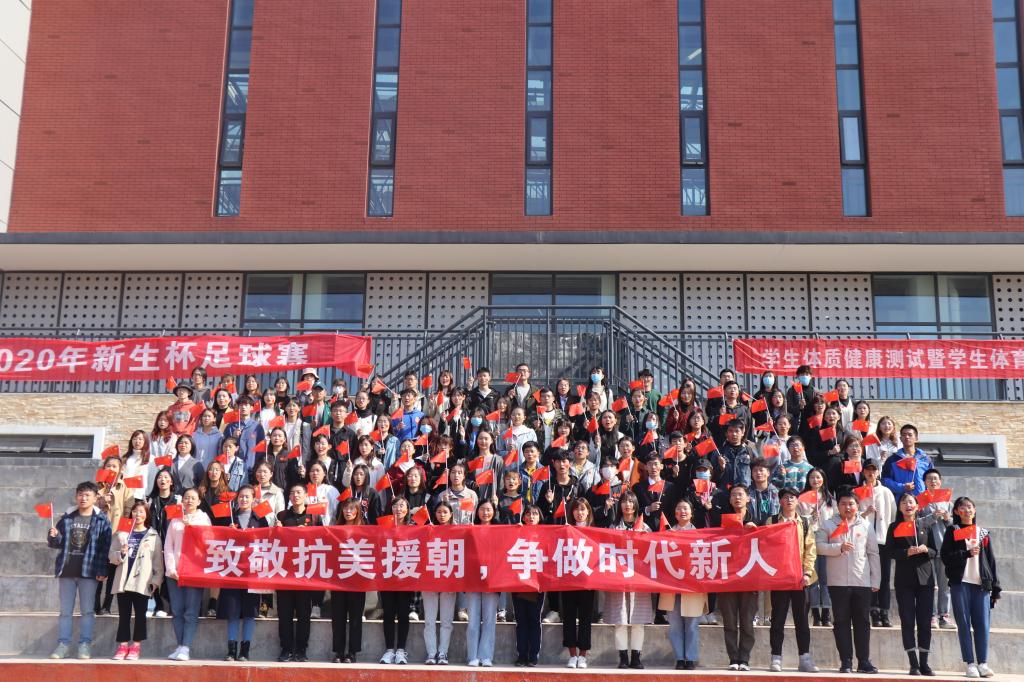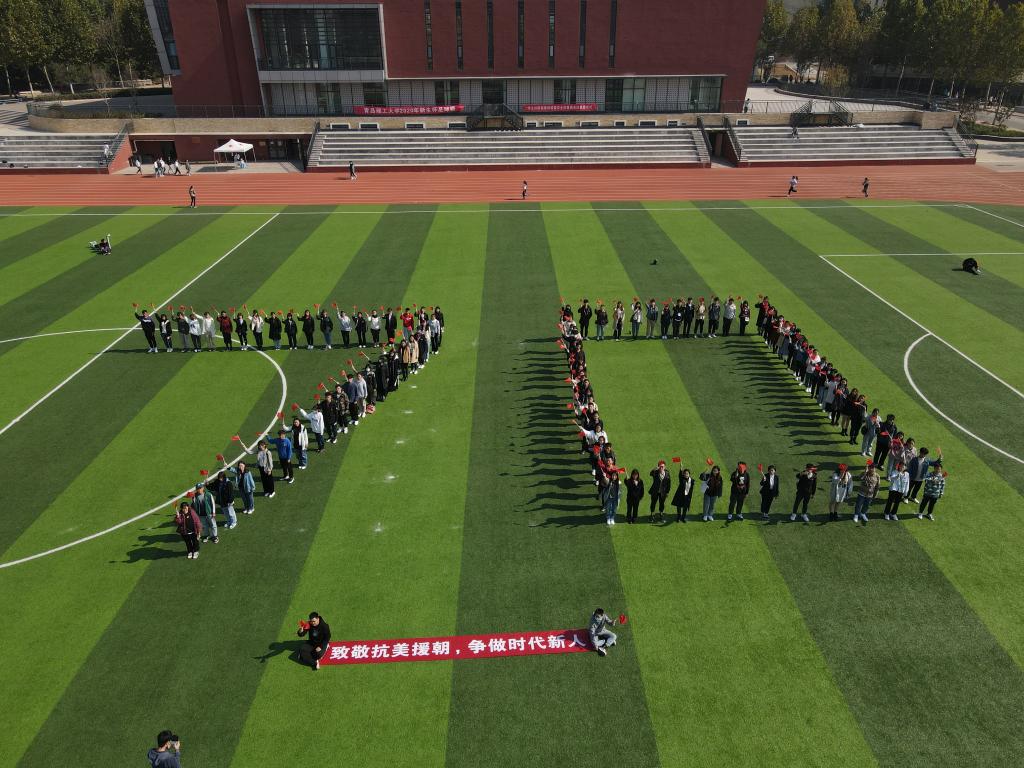在东运动场,同学们站成70的字样,挥舞国旗,高唱红歌,开展快闪活动。沈文青来到师生中间,大家一同高歌,唱出对抗美援朝英雄儿女的崇高敬意和对伟大祖国的热爱与祝福。“致敬抗美援朝,争做时代新人”“祝福伟大祖国繁荣昌盛”的齐声祝福响彻校园。