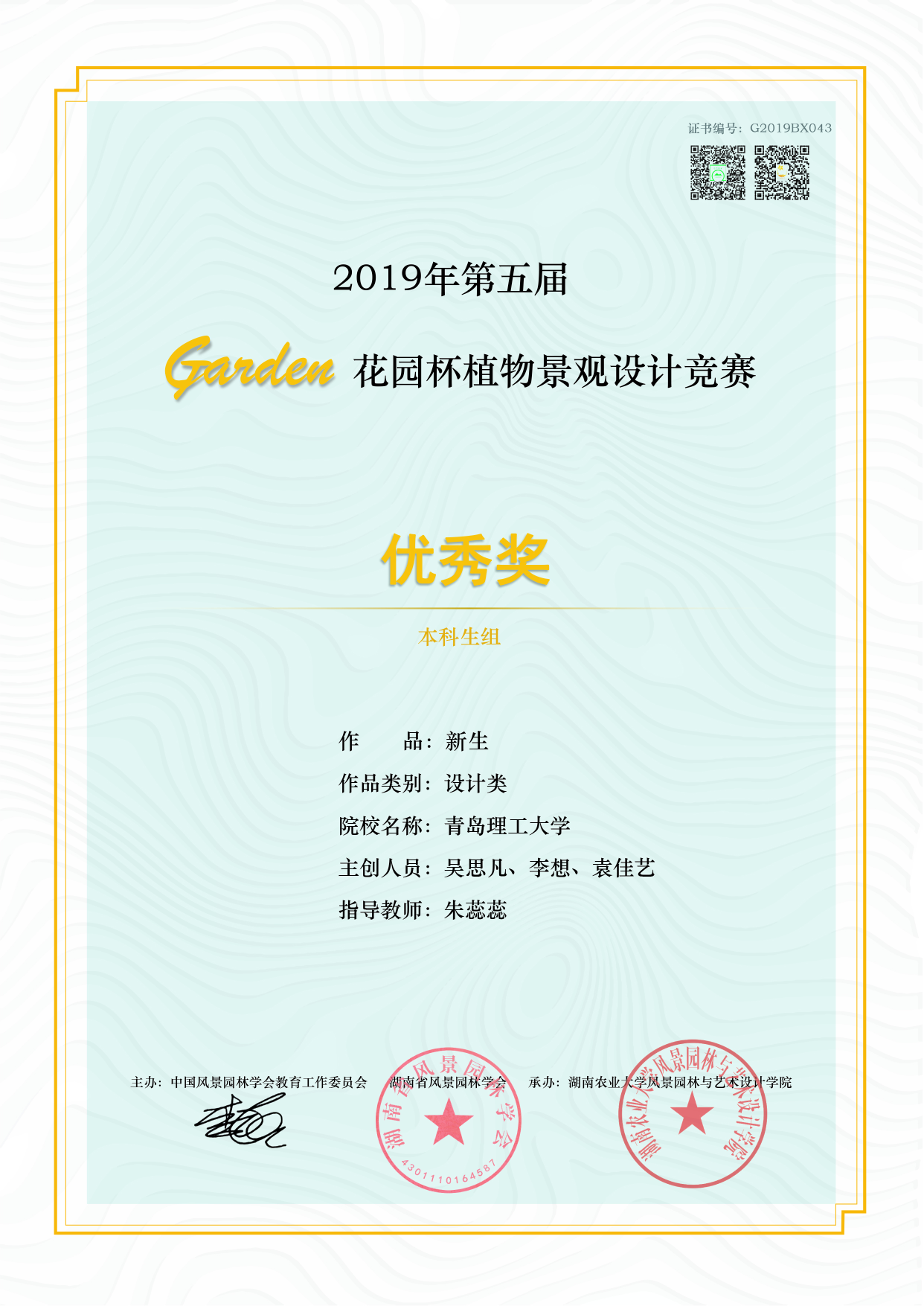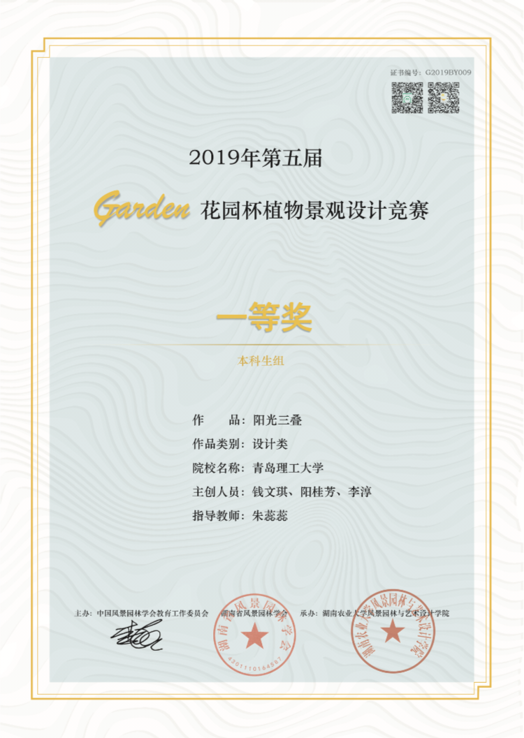 由朱蕊蕊老师指导,风景园林专业2017级本科生贺沁璇、刘钰靖完成的作品《像素定格-基于儿童乐园的老旧社区可持续发展更新》荣获二等奖。由朱蕊蕊老师指导,风景园林专业2017级本科生赵明婕、毛颜康、杨子茹完成的作品《滋源-青岛小村庄社区植物种植规划》;由朱蕊蕊老师指导,胡路瑶、汤茗程、廖麟杰完成的作品《未泯-自然教育社区公园》;由阎婫、姚文飞、王叁指导,风景园林专业2018级本科生莫晓晴完成的作品《绿野仙踪-以自然教育为背景的社区绿地生态设计》荣获三等奖。由朱蕊蕊老师指导,风景园林专业2017级本科生徐启明、胡业超、王亚菲完成的作品《光阴-基于儿童自然教育的社区花园设计》,吴思凡、李想、袁佳艺完成的作品《新生-情境化下的自然体验式教育》;由阎婫、姚文飞、王叁老师指导,风景园林专业2018级学生李金凤完成的作品《野孩子-基于自然教育理念的社区花园更新设计》荣获优秀奖。