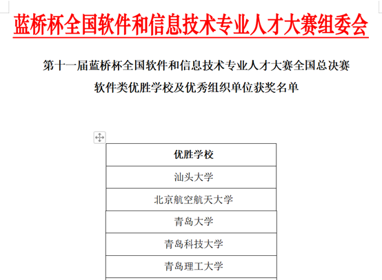 11月14日,第十一届“蓝桥杯”全国软件和信息技术专业人才大赛全国总决赛在全国600多个赛点成功举办,来自北京大学、清华大学、复旦大学、上海交通大学、北京航空航天大学和哈尔滨工业大学等高校在内的800余所高校的顶尖选手参加本次巅峰对决。伟德官网信息与控制工程学院学生表现突出,荣获一等奖1项、二等奖7项、三等奖10项、优秀奖4项,伟德官网被评为全国总决赛“软件类优秀组织单位”。