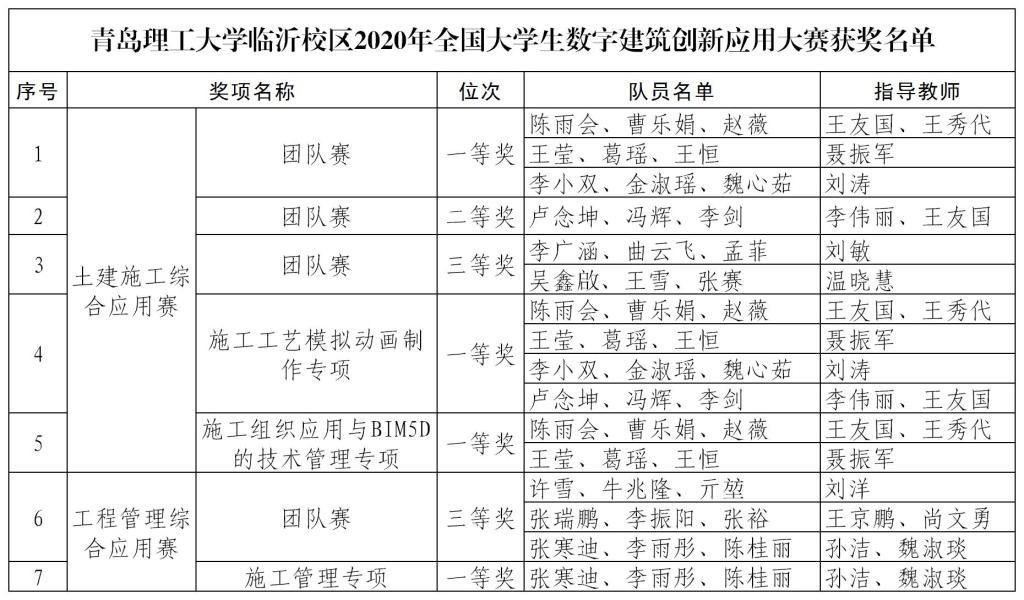 近日,由中国建设教育协会主办,广联达科技有限公司和北京睿格致科技有限公司协办的2020年全国大学生数字建筑创新应用竞赛结果揭晓,临沂校区选派的9支队伍获得专项一等奖7项、团队一等奖3项、团队二等奖1项、团队三等奖5项的好成绩。