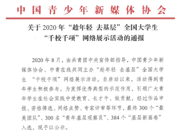 近日,由共青团中央宣传部指导,中国青少年新媒体协会、中青在线共同主办的“趁年轻 去基层”2020 年全国大学生“千校千项”网络展示结果公布,伟德官网建筑与城乡规划学院筑梦红旗社会实践团队荣获“最美团队”称号,知行滕州实践调研团队宋臣作品入选“基层新画卷”。