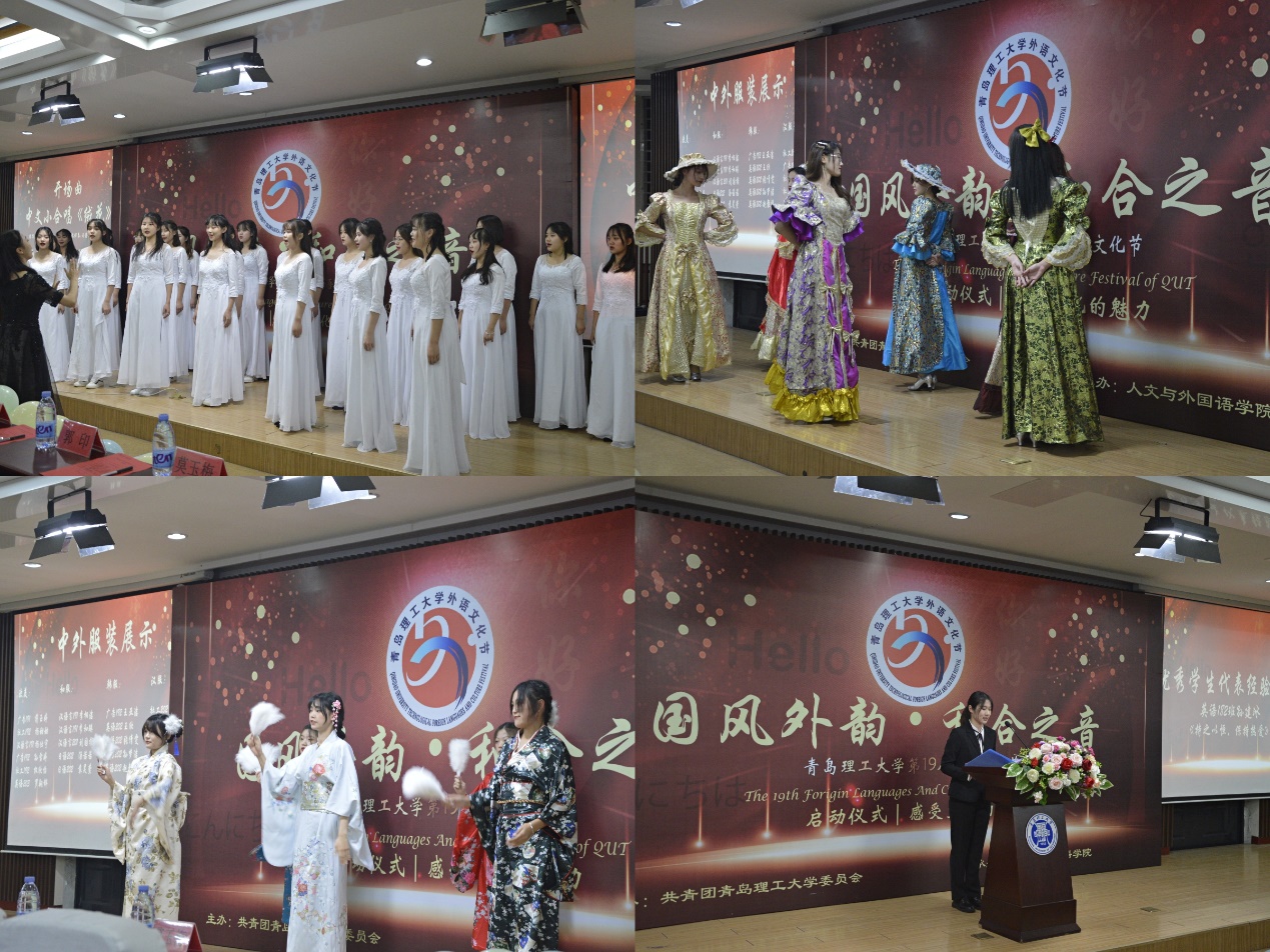 本次开幕式在中文小合唱《绒花》中缓缓拉开帷幕。“羽音中和”合唱团用饱含情感的动人歌声,带领大家回顾了先辈革命征程,使在场观众置身于历史的回声之中。中外服装展体现别出心裁的文化特色,身着汉、韩、日、欧洲各国服装的学子们依次上台走秀展示,配合着音乐翩翩起舞,将民族文化与异国风情的完美交融,让现场观众深深沉浸在中外灿烂辉煌的文化内涵中。优秀学生代表英语182班孙建冰从“听、说、读、写”四个方面讲述自己的英语学习方法,悉心讲解有效改善方法,督促同学努力提升自身素质。英语191班于晓斐以一首原创歌曲Chasing Myself In you为在场师生带来一场听觉盛宴,标准的发音、动听的旋律引起观众席上阵阵掌声。