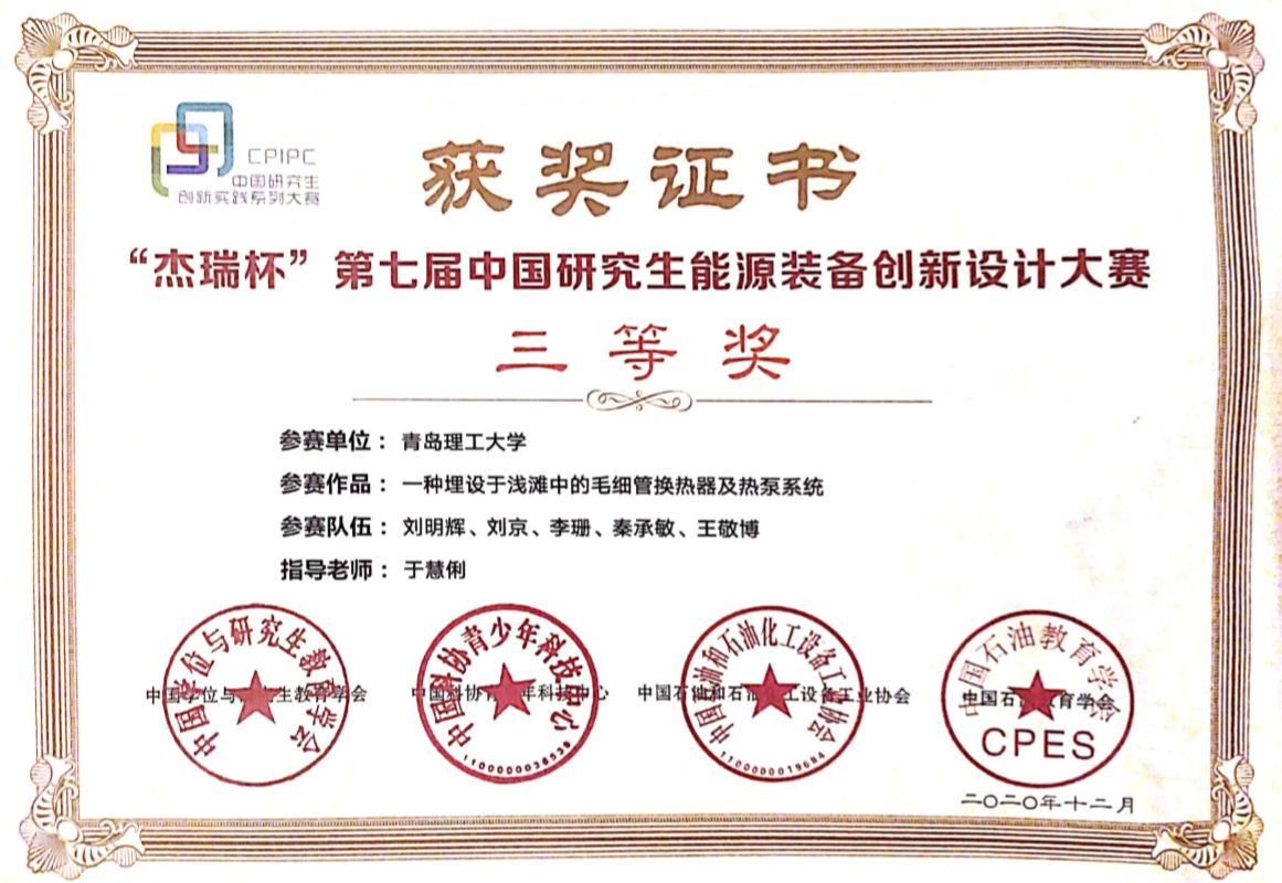 2020年比赛共吸引全国171个培养单位的4268名研究生,共计1019项作品参赛,参赛学校和作品数量均创历史新高。经过网上初评、专家会评、决赛答辩等诸多环节的层层选拔,最终作品《一种埋设于浅滩中的毛细管换热器及热泵系统》获得了评委专家们的一致认可,取得了三等奖的优异成绩。