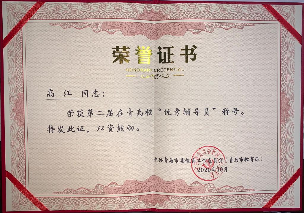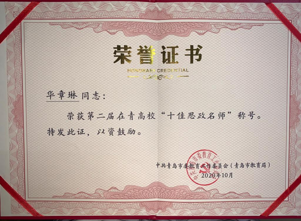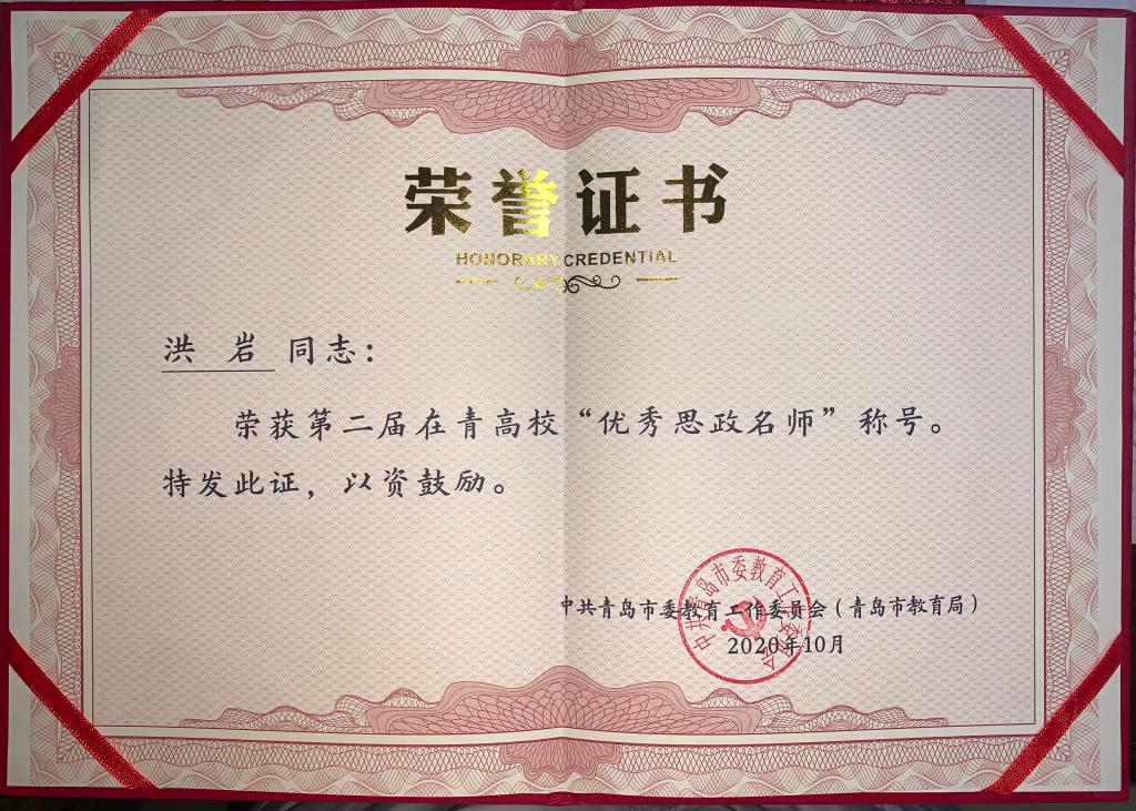 近日,青岛市委教育工委为第二届在青高校“十佳思政名师”“十佳辅导员”颁发荣誉证书。伟德国际1946bv官网华章琳、邵先锋分别获评第二届在青高校“十佳思政名师”“十佳辅导员”。洪岩、高江分别获评第二届在青高校“优秀思政名师”“优秀辅导员”。