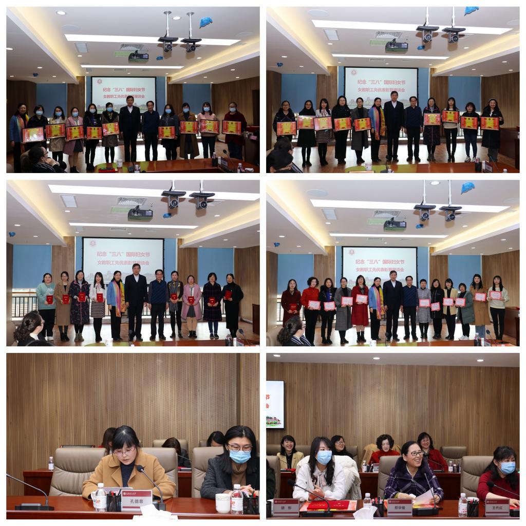 与会领导为2020年度“女教职工先进集体”“三八红旗手”和“女教职工工作先进个人”颁发了荣誉证书。女教职工先进集体人文与外国语学院公共外语第一教研室主任孔德蓉、“三八红旗手”马克思主义学院教师邢学敏,分别作为获奖女教职工代表进行了经验交流。