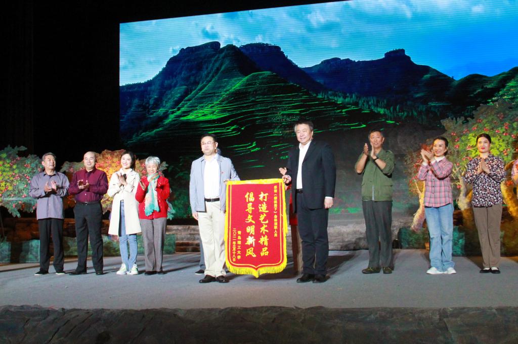 舞台剧目编排精妙、情节生动、耐人寻味,演职人员全情投入,方言台词生动俏皮,引起了观众的强烈共鸣,演出现场掌声不断。演出结束后,现场观众全体起立向演职人员鼓掌致敬,李国华代表学校向《樱桃崮下》剧组赠送了锦旗表示感谢。