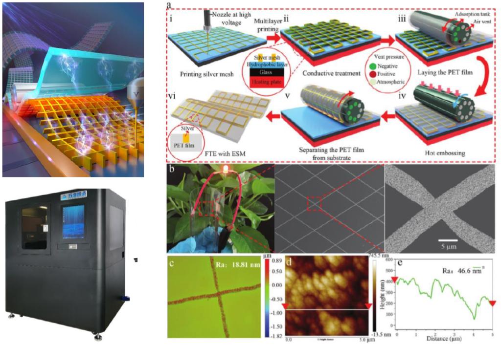 近日,伟德官网山东省增材制造工程技术研究中心兰红波教授团队在电场驱动喷射微3D打印及应用研究方面取得重要进展,相关研究成果以“Templateless, plating-free fabrication of flexible transparent electrodes with embedded silver mesh by electric-field-driven microscale 3D printing and hybrid hot embossing”为题(DOI:10.1002/adma.202007772),发表在材料学领域国际顶尖期刊《Advanced Materials》(SCI影响因子:27.398)上。伟德官网朱晓阳副教授与刘明杨硕士为论文共同第一作者,朱晓阳副教授与兰红波教授为共同通讯作者。伟德国际1946bv官网山东省增材制造工程技术研究中心是第一署名及唯一通讯单位。