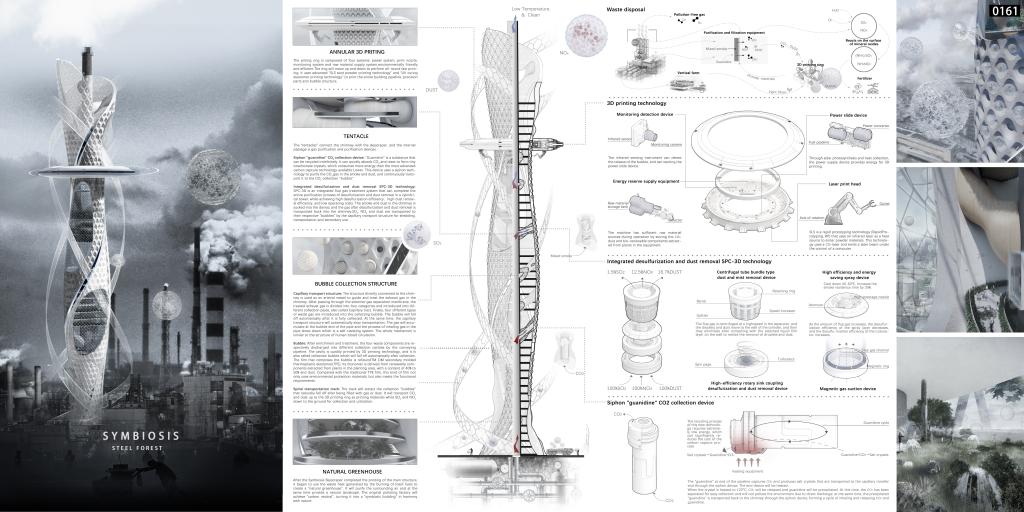 伟德官网获奖作品《烟囱:共生》针对的是工业烟囱对环境的影响。Symbiosis摩天大楼依附在烟囱之上,烟囱为其提供能量和材料,Symbiosis摩天大楼吸收有害物。Symbiosis摩天大楼最开始只需要一个3D打印环,打印材料完全由烟囱燃烧的废物和植物纤维提供,从烟囱最底部开始螺旋上升环绕打印。随着Symbiosis摩天大楼的生长,其吸收烟囱产生有害物质的能力不断提高,减少烟囱的排放。当其达到最终形态,工厂烟囱将不再排出有害物,同时利用烟囱所产生的废弃热打造不同的植物温室,净化周围的空气,将烟囱变成与自然融合的共生建筑。实现“碳中和”。