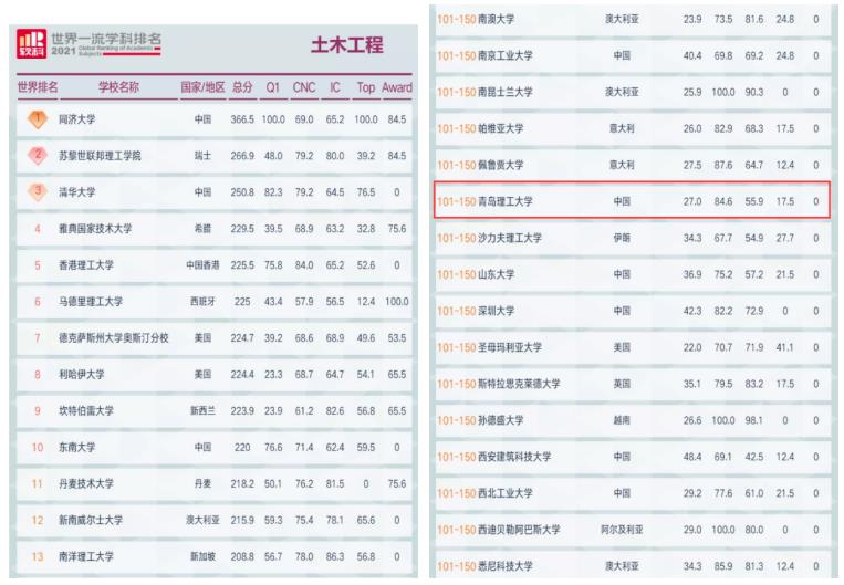 日前,软科公布了2021世界一流学科排名。在土木工程学科中,全球共有300所高校上榜,其中,中国共有67所大学(内地60所)。同济大学、清华大学、东南大学等20所内地大学位列土木工程学科前100名;伟德国际1946bv官网、长安大学等11所大学位列全球土木工程学科101-150名,其中,伟德国际1946bv官网土木工程学科稳居山东省属高校首位。
