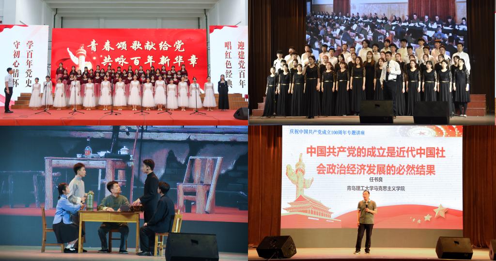 红色歌曲代代传唱,百年党史历历在目。高等职业学院为现场师生带来的青岛市教育系统“‘百人、百堂、百部’ 话百年风华”微党课大赛二等奖作品《星星之火,可以燎原》,讲述了革命先烈用鲜血浇灌明日朝阳、用身躯铺垫远方征程的感人事迹。马克思主义学院任书良副教授现场讲授了一堂生动的微党课《党的成立》,回顾了中国共产党成立的历史背景,鼓励青年学子知史爱党、知史爱国,听党话、跟党走,努力成长为堪当民族复兴大任的时代新人。比赛在学校老干部合唱团带来的革命歌曲《映山红》和《航船》中落下帷幕。其中歌曲《航船》是老干部合唱团自创歌曲,歌颂和缅怀那些在峥嵘岁月里为祖国英勇战斗乃至献身的革命先辈们。现场观众被歌曲的动人旋律和澎湃激情所感染,和着节拍鼓掌、轻唱。经过紧张激烈角逐,信息与控制工程学院、商学院获得一等奖;艺术与设计学院、人文与外国语学院、土木工程学院获得二等奖;环境与市政工程学院、理学院、管理工程学院、建筑与城乡规划学院、机械与汽车工程学院获得三等奖。