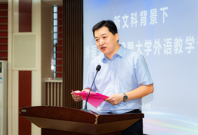 为推动伟德官网外语学科创新发展,加强外语学科专业建设,探索新文科背景下外语学科发展范式和路径,7月16日上午,人文与外国语学院于嘉陵江路校区主教学楼一楼东报告厅召开“新文科背景下外语学科建设暨大学外语教学研讨会”。校党委常委、统战部部长陈伟致欢迎词,人文与外国语学院党委书记卢新明、院长巩湘红、学院其他领导班子成员及外语学科教师参加此次研讨会。
