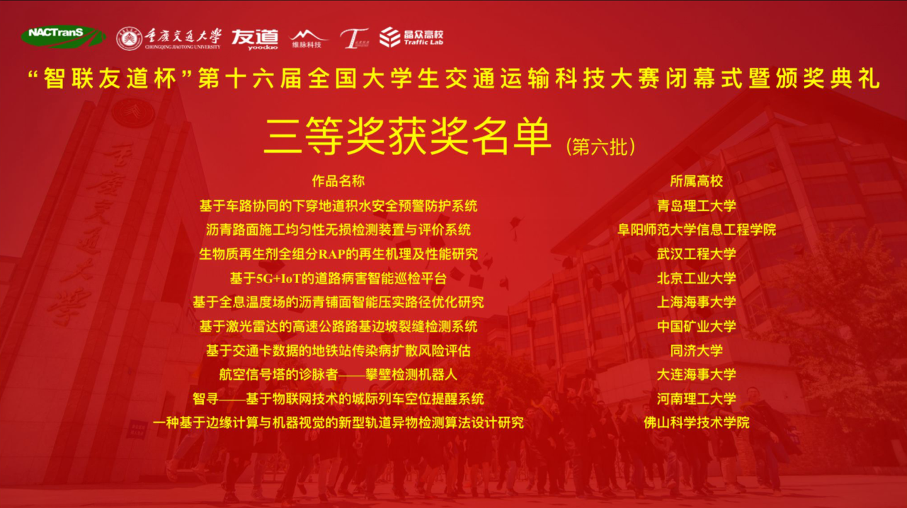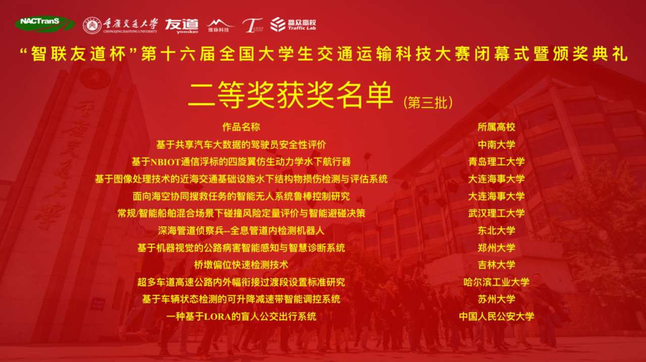 7月24日-25日,“智联友道杯”第十六届全国大学生交通运输科技大赛在重庆交通大学落下帷幕。伟德官网选派的机械与汽车工程学院2支队伍入围决赛,最终取得了二等奖1项、三等奖1项的优异成绩。