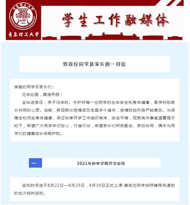 学生工作处召开多次专题会议,布置返校(入学)方案。制定《2021年秋季学生返校工作实施方案》、《2021级新生入学工作实施方案》,编写《致返校同学及家长的一封信》、《致2021级新同学及家长的一封信》,通过多种渠道耐心细致做好相关方案政策解读。利用假期时间对学生宿舍进行改造升级,制定暑期公寓调整方案,完成宿舍消杀、通风、检修、卫生工具配备等工作,并提前做好新生集训军训、资困助学、劳动教育等各项准备工作,为秋季学生返校和新生入学做好了充分的准备。