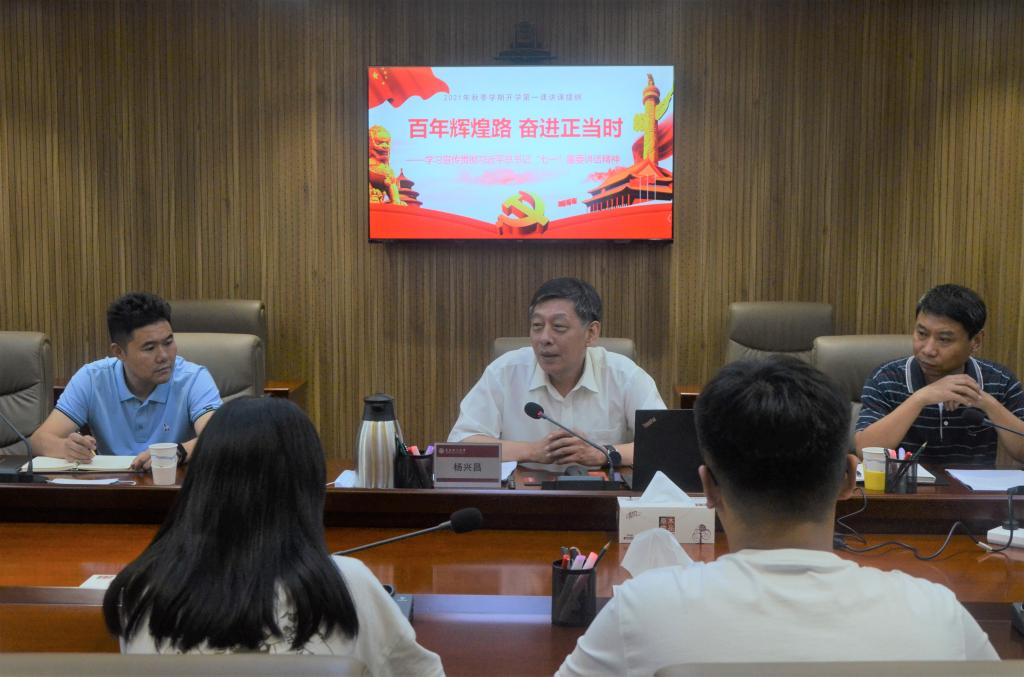 杨兴昌以“百年辉煌路 奋进正当时”为题,从“准确把握习近平总书记“七一”重要讲话的重要意义,认真学习习近平总书记“七一”重要讲话蕴含的百年党史中的数字密码,深刻领会习近平总书记“七一”重要讲话的新思想、新观点、新要求,在学懂弄通做实上下功夫,做勇于担当民族复兴大任的新时代大学生”四个方面深度解读了习近平总书记“七一”重要讲话内容。杨兴昌指出:习近平总书记“七一”重要讲话史诗般展现了中国共产党波澜壮阔的百年历程,是对党的百年奋斗历程的全面总结,也是党团结带领人民以史为鉴、开创未来的行动指南,为党新的征程指明了前进航向。从青年学生的视角,要认真学习领悟,深入把握实现中华民族伟大复兴中国梦的重大意义、科学内涵、现实任务,增加为实现民族复兴伟业不懈奋斗的政治自觉。树立远大理想,胸怀伟大祖国,厚植爱国情怀,坚定“四个自信”,练就过硬本领,敢于拼搏奋斗。