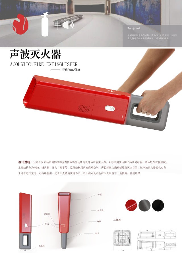 其中,由产品设计教研室李东老师指导的产品设计181班员玮同学的作品《SG-MAKE一体智能滑雪护目镜》获山东赛区一等奖。作品在充分调研的基础上确定了其简约、一体化的造型,在功能上增加了AR现实增强技术、声音骨传导技术,可提供滑雪时对雪场和个人状况信息的显示和辅助。雪镜同时还带有照相、音乐、接打电话等功能,若附近带有同雪镜系统的滑雪者,则可以显示对方用户名与信息,提供给滑雪者更自由的社交。由李东老师指导、张爽同学创作的《声波灭火器》荣获山东赛区一等奖。该作品主要针对实验室、博物馆等含有贵重物品的场所而设计的一款灭火器。产品主体结构分为声腔,电源和把手三部分。使用时由低频声波通过扬声器发出,声腔对准火焰根部从而达成灭火目的。设计亮点在于低碳环保易操作,灭火“声过无痕”,极大程度上挽救财产损失。