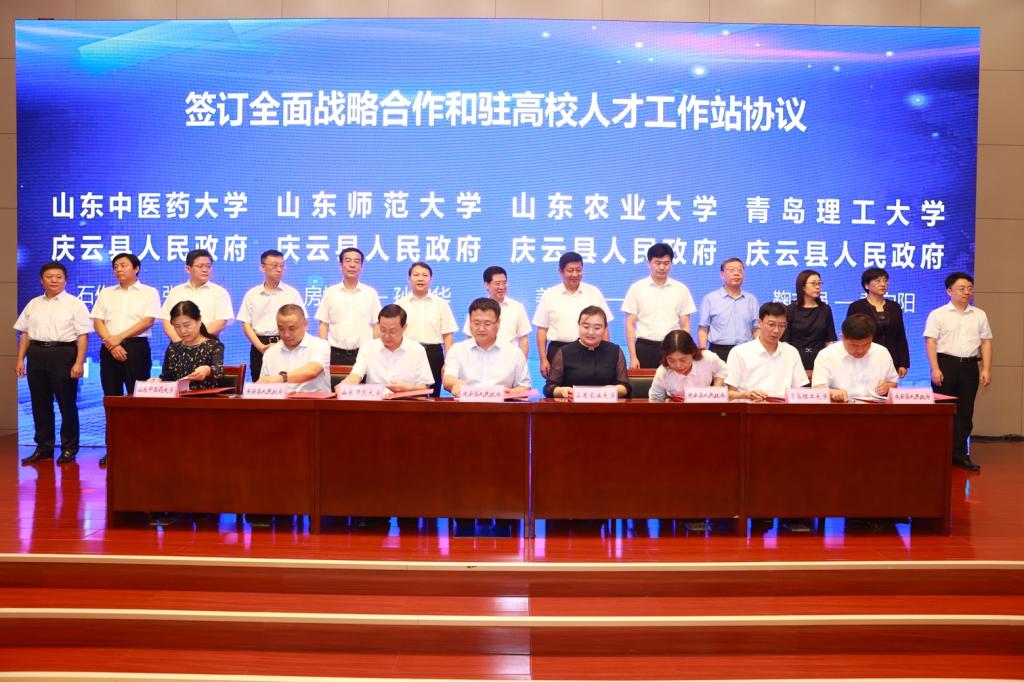 9月17日,山东省庆云县举行“才聚庆云”校地协同创新发展签约暨新时代企业家培养锻炼计划启动仪式。仪式上,伟德国际1946bv官网等省内8所高校与庆云县签订全面战略合作和驻高校人才工作站协议,伟德官网党委常委、副校长齐德义及其他7所高校领导应邀参会,德州市人大常委会副主任、县委书记王晓东,县委副书记、县长吕德山,德州市委组织部副部长刘刚等参加签约活动。会议由庆云县委副书记、县长吕德山主持。