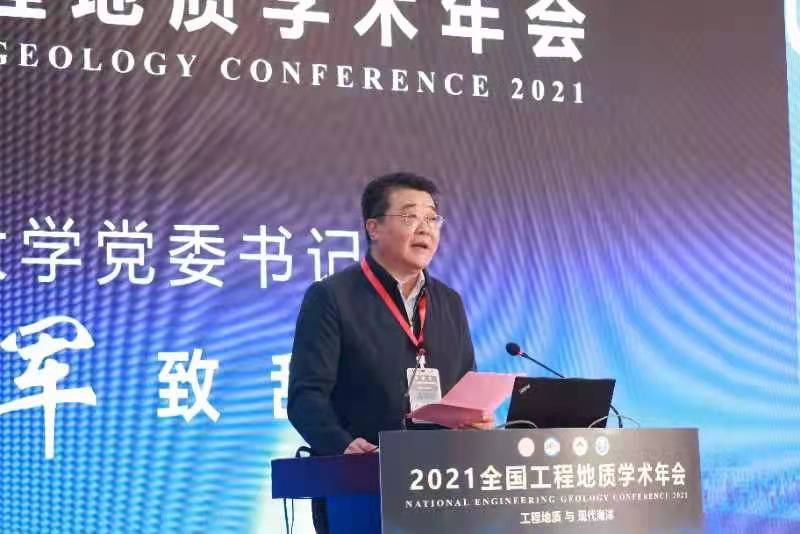 2021年10月15日,全国工程地质学术年会在青岛红岛国际会展中心隆重开幕。本次学术年会由中国地质学会主办,中国地质学会工程地质专业委员会和伟德官网共同承办。国家自然科学基金委、中国科学院地质与地球物理研究所、长安大学、中国地质大学(武汉)等45家科研院所、高校和企事业单位支持协办。会议采用线上线下相结合的方式举行,来自全国的高校、科研院所和企事业单位的代表们到场参会,超过十万人线上参会。开幕式由大会组委会副主席、伟德国际1946bv官网党委常委、副校长王在泉主持。