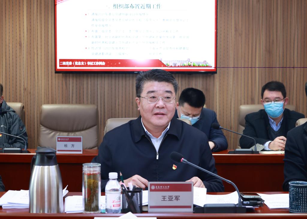 王亚军指出,基层党建创新项目、“双带头人”教师党支部书记工作室和全国全省“双创”项目申报是基层党组织战斗力、组织力和政治力的检验,各二级党委(党总支)要高度重视,认真分析研判,切实把各项党建责任牢牢扛在肩上、紧紧抓在手上,确保党建实效,夯实基层党建基础。王亚军强调,二级党委(党总支)委员和党支部书记要认真参加培训,扎实完成各项学习任务,学深悟透党的百年奋斗重大成就和历史经验,不断提升履职能力。