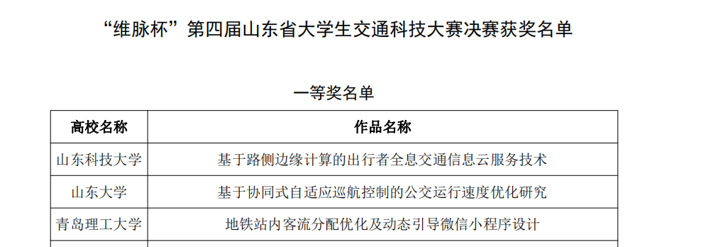 机械与汽车工程学院高度重视本次比赛,积极组织师生备战参赛,做好选拔培训指导。赛前,学院组织了山东省交通科技大赛伟德国际1946bv官网校赛选拔赛和赛前培训会,邀请学院潘福全,魏金丽、杨金顺、徐卫晓等老师进行培训指导。经过激励角逐,《地铁站内客流分配优化及动态引导微信小程序设计》获得山东省一等奖,《基于车路协同的城市道路积水风险点识别预警系统》、《基于智能手机GPS数据的城市快速路车辆冲突风险实时评估系统研发》、《天喜智行—基于人机交互的多功能智能轮椅》获得山东省二等奖。
