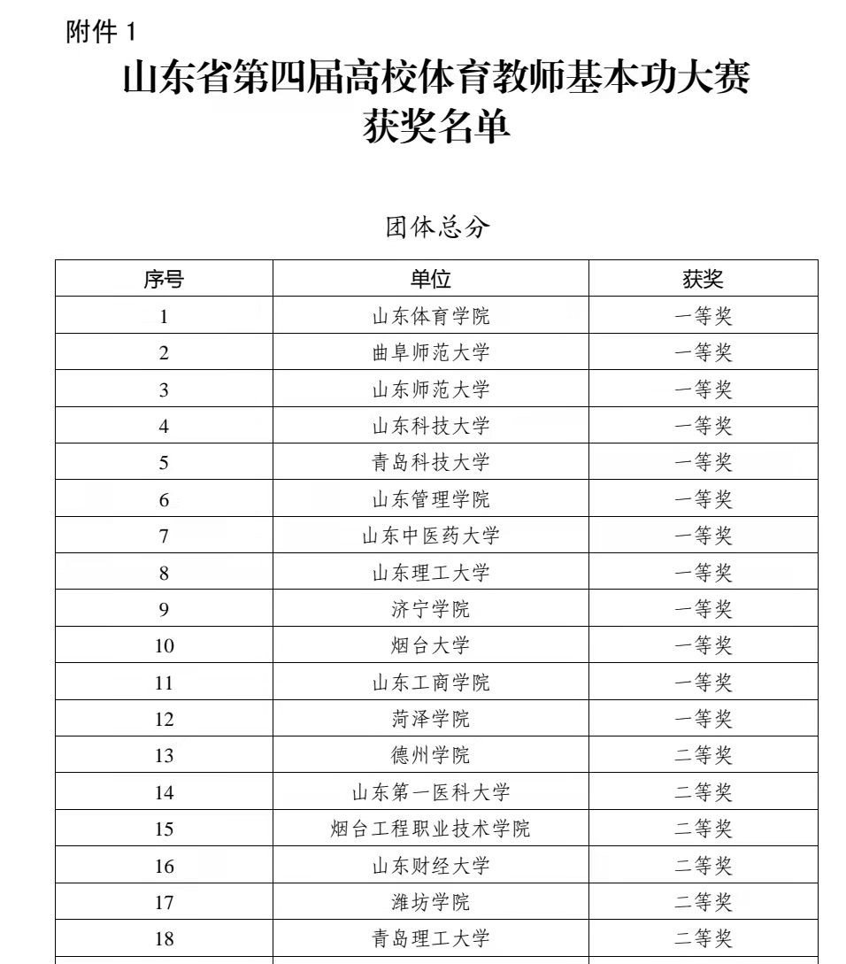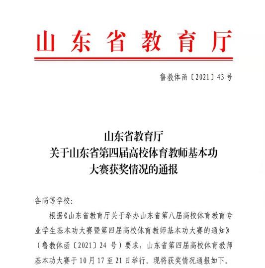 近日,山东省教育厅下发《山东省教育厅关于山东省第四届高校体育教师基本功大赛获奖情况的通报》(鲁教体函〔2021〕43 号),伟德官网取得个人一等奖一项、二等奖五项、三等奖五项,团体总分二等奖的好成绩。