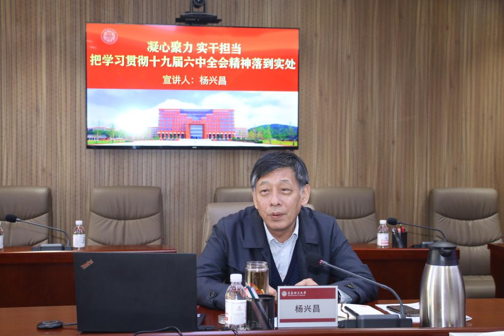 杨兴昌在宣讲中,从深刻理解三个“需要”、两个“确立”、五大“历史意义”、十个“坚持”、牢记一个“根本问题”、四个“必须”、一个“号召”等内容,到如何深刻把握《决议》核心要义和实践要求,将学习贯彻党的十九届六中全会精神转化为推动学校内涵式高质量发展的强大动力进行了系统讲解和阐释。
