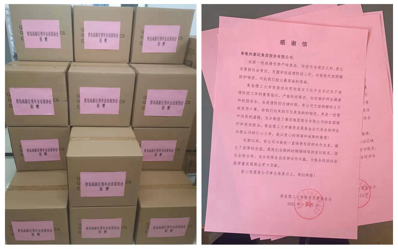 新一轮疫情形势严峻复杂,防控任务艰巨,广大校友密切关注学校的疫情防控工作以及师生员工的生活状况,主动伸出援助之手,与学校沟通确认紧缺物资规格和标准后,积极捐赠各类防疫物资用于支持学校疫情防控工作。目前已有青岛市高新区青年企业家协会、青岛瑞源控股有限公司、豪迈集团股份有限公司等友好合作单位以及林宁波、张鑫洋等校友纷纷捐款捐物支持学校疫情防控。学校教育发展基金会已逐一致信表示感谢。