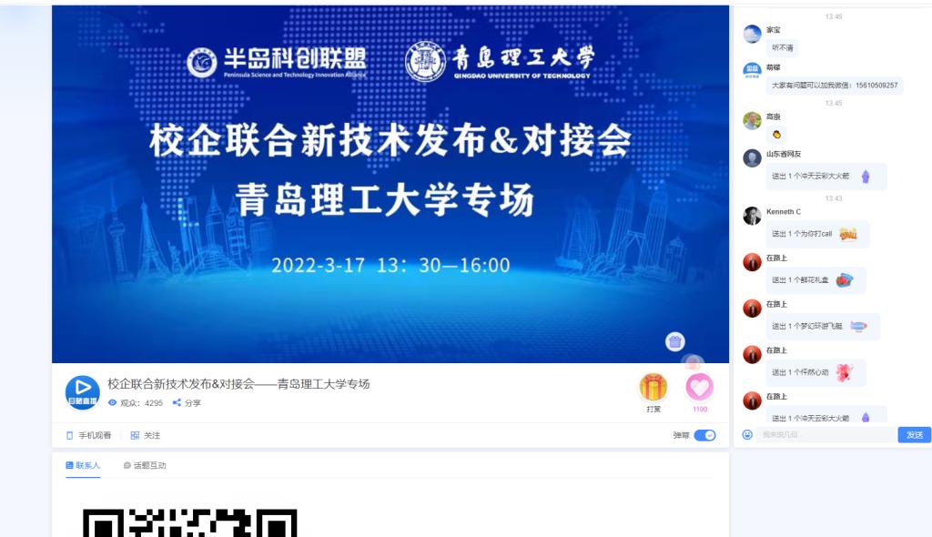 科技处(成果转化办公室)主动对接西海岸新区科技局、校城融合办公室等部门以及半岛科创联盟、柠檬科技等社会化机构。为西海岸新区遴选41名优秀博士教师作科技特派员,主动对接服务企业。谋划制作学校科技成果转化专题宣传视频进行网络发布。3月17日,学校联合半岛科创联盟、柠檬科技借助“云端研发”模式举办了“校企联合新技术发布&对接会——伟德国际1946bv官网专场”,探索开启了伟德官网深化校地校企合作和促进学校科技成果转移转化线上对接新模式。