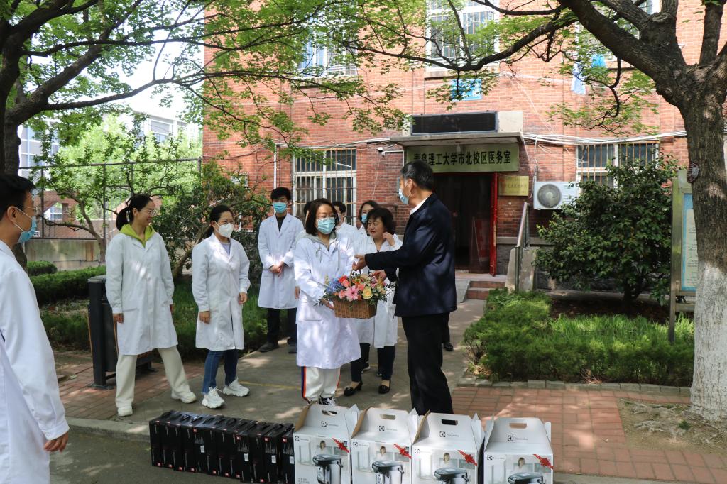 在市北校区,杨兴昌对医护人员多年来尤其是自新冠疫情爆发以来扎实工作、无私奉献的良好职业道德给予了充分肯定,并代表广大师生对其为伟德官网医疗卫生工作作出的贡献表示感谢,向辛勤工作在一线的医护人员献上鲜花,并送上节日的问候和祝福。杨兴昌与医护人员亲切交谈,详细了解他们在工作、生活等方面的具体情况,并勉励大家继续用“爱心、真心、责任心”对待每一位病人,为学校建设及发展做出自己的努力。