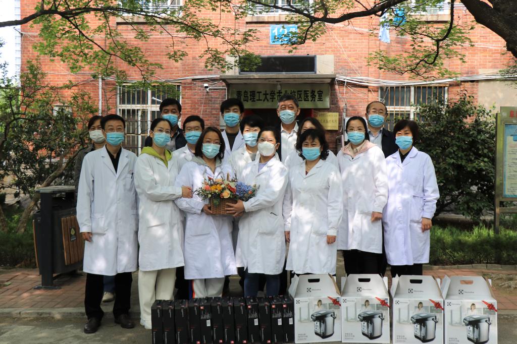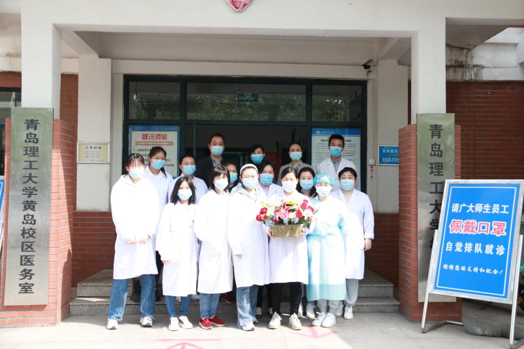 在西海岸新区主校区校医院,沈文青代表学校向全体医护人员表示慰问和崇高敬意,并为医护人员送上鲜花和节日的祝福。她表示,全体医务人员积极响应学校部署要求,“白衣执甲”始终坚守校园疫情防控一线,严格值班值守,舍小家、顾大家,展现了大公无私的奉献精神和舍我其谁的责任担当,为学校安全有序运转和师生安全健康提供了保障学校不会忘记,广大师生不会忘记。