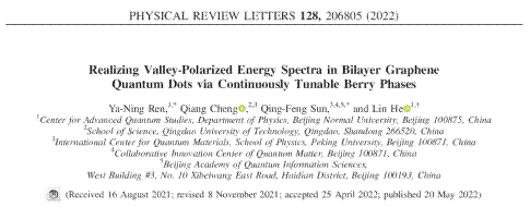 近日,理学院物理学科程强副教授与北京师范大学何林教授、任雅宁博士,北京大学的孙庆丰教授合作,在国际顶级期刊《Physical Review Letters》上发表了题为“Realizing Valley-Polarized Energy Spectra in Bilayer Graphene Quantum Dots via Continuously Tunable Berry Phases”的学术论文。程强与任雅宁为论文共同第一作者,何林和孙庆丰为论文通讯作者。这是伟德官网首次在该物理学顶级期刊发表论文,实现了伟德官网物理学科的历史性突破。该研究工作得到了国家自然科学基金委、国家重点研发计划、以及北京师范大学和北京大学的经费支持。