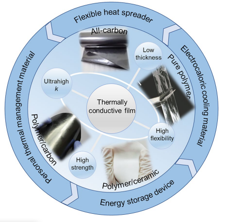 近些年,随着电子设备集成度、工作频率和功率密度的不断提高,电子设备的过热问题越来越严重,而解决过热问题的主要策略是通过热管理材料将多余的能量从电子设备中传导到外部环境。与传统的热管理材料相比,具有高面内导热系数的柔性导热薄膜材料在过去的十年里引起了学者们的极大兴趣,在下一代器件的热管理应用中显示出巨大的潜力。