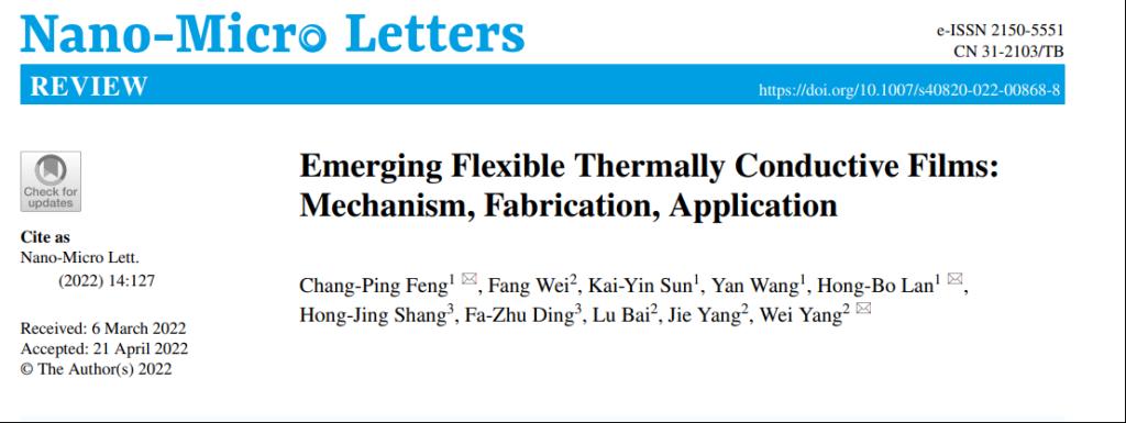 近日,机械与汽车工程学院冯昌平副教授在国际顶级期刊《Nano-Micro Letters》上发表了题为“Emerging Flexible Thermally Conductive Films: Mechanism, Fabrication, Application”的最新研究成果。伟德国际1946bv官网山东省增材制造工程技术研究中心为第一署名通讯单位,冯昌平副教授为论文第一作者和第一通讯作者,兰红波教授和四川大学杨伟教授为论文共同通讯作者。《Nano-Micro Letters》是2021年中科院Q1的TOP期刊,SCI影响因子16.419,具有重要国际影响力,这是伟德官网首次在该顶级期刊发表论文。